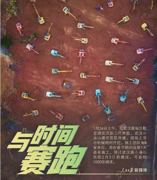 從1月23日宣布“武漢決定建設(shè)一座‘小湯山’,阻擊肺炎疫情蔓延”到醫(yī)院建成,用時整十天。
