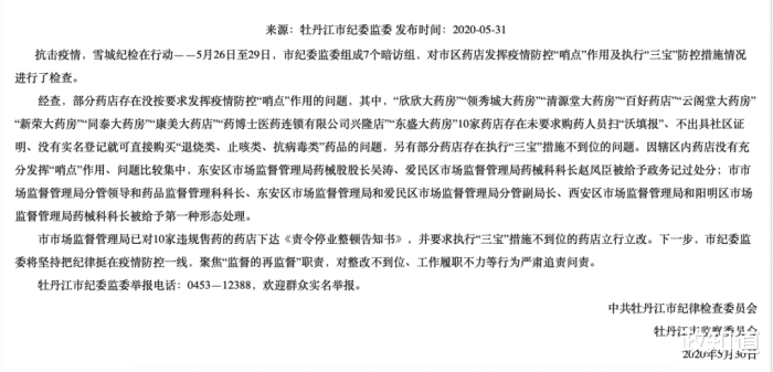 5月30日,牡丹江發(fā)布《關(guān)于市區(qū)藥店發(fā)揮疫情防控“哨點(diǎn)”作用不力典型案件的通報(bào)》。